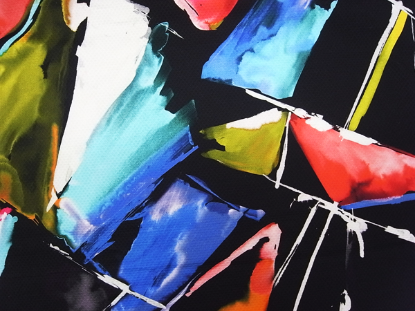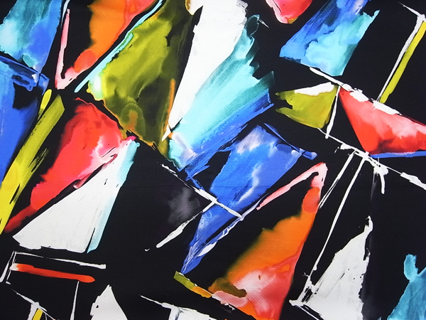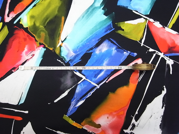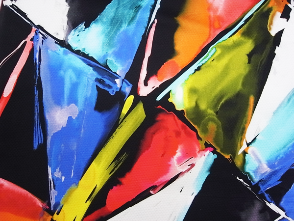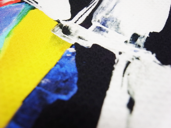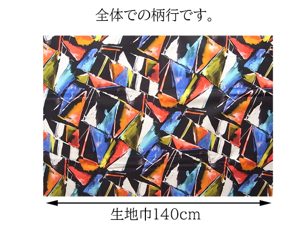 黒地に赤×ブルー×イエローの色使いで鮮やか柄がプリントされた一品。