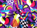 パープル、ピンク、グリーンのなどのマルチカラーの色使いで芸術的な抽象柄がプリントが施されています。