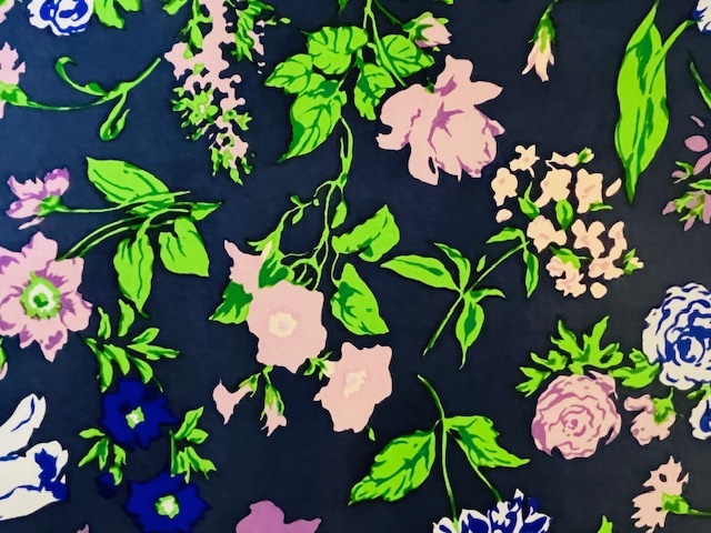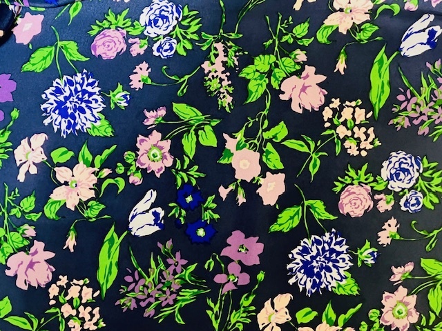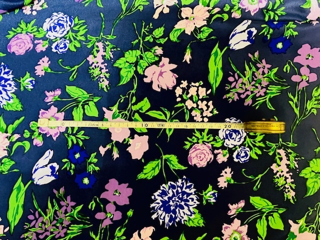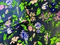 ネイビーの上質なヘビーシルク地にブルー×パープル×グリーン色で花柄プリントが施された一品。