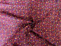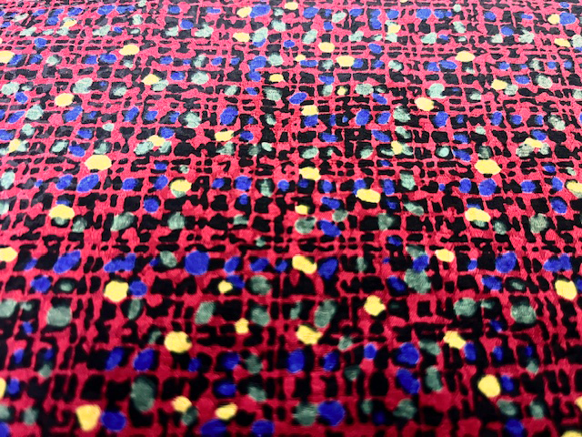 エンジ×ブルー×イエローの色使いで小柄プリントが施された秋冬らしい落ち着いた一品です。